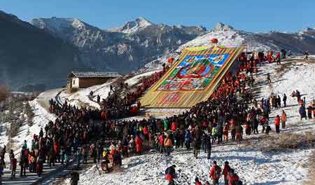 2月26日,甘肃郎木寺举行一年一度的晒佛仪式。 晒佛即晾晒寺院中供奉的大型佛像唐卡。这项宗教活动包括一系列法事和仪式,隆重庄严,周边信众都要前来朝拜瞻佛。(来源:新华网)