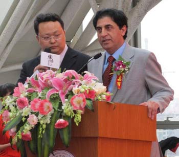 巴基斯坦驻华使馆新闻参赞穆罕默德·拉加(右)在发布会上致辞