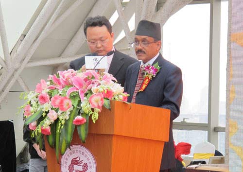 尼泊尔驻华大使卡尔基(右)在开幕式上致辞