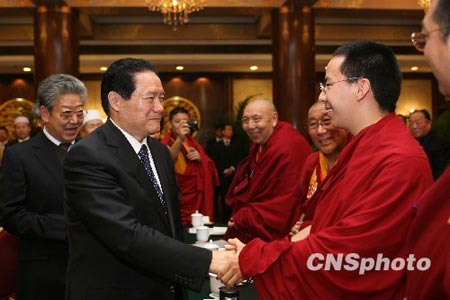 3月4日,中共中央政治局常委、中央政法委书记周永康来到全国政协宗教界委员小组讨论现场,与委员们共商国是。图为周永康与新增补的全国政协委员十一世班禅额尔德尼·确吉杰布握手致意。 中新社发 杨可佳 摄