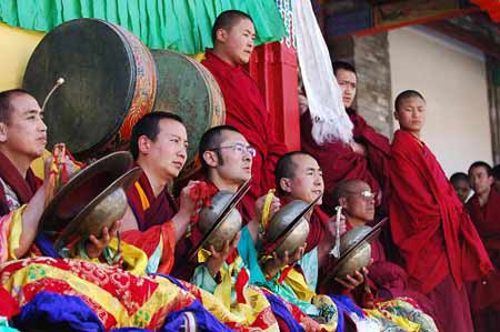 2月27日,塔尔寺僧人用手中的舞钹为跳神伴奏。 新华社记者 张宏祥 摄