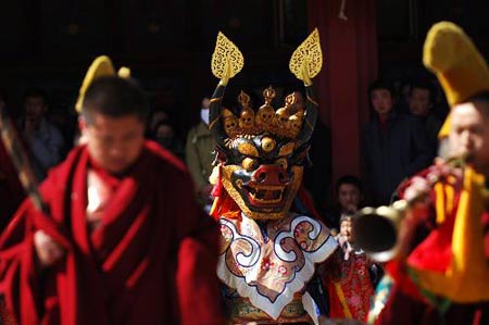 2月27日,塔尔寺一名僧人头戴面具在法号的伴奏下跳神。新华社记者 张宏祥摄