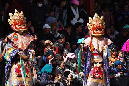 2月27日,藏族群众和游客在塔尔寺观看跳神活动。 新华社记者 张宏祥 摄