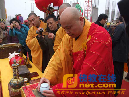 果光法师带领四众弟子洒净并现场开示后,进行器宝装藏、盖宫。