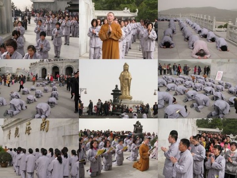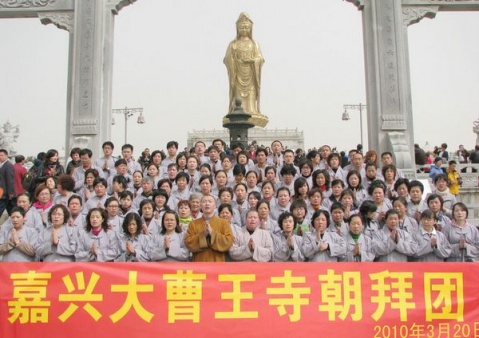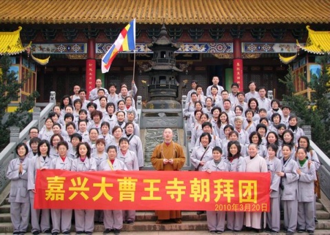 2010年3月20日来自广东、宁夏、山东、安徽、上海、深圳、辽宁、嘉兴、 南京、箫山、大连、常州、杭州、河北、黑龙江、苏州、徐州、陕西等全国 各地的佛弟子一行90人云集一处,在浙江嘉兴大曹王寺主持上维下华大师的 引领下,怀着一颗对佛菩萨的虔诚心、恭敬心、感恩心,首次三步一拜朝礼 海天佛国普陀山。最小的居士年仅22岁,年龄长的居士72岁。历经2小时20 分朝拜至33米南海观世音菩萨铜像前,大众共同祈愿世界和平,国太民安, 风调雨顺,繁荣昌盛,法轮常转,正法久住。