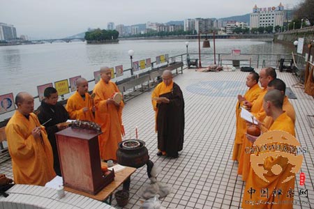 早晨7点30分,慧定法师带领学僧到韶关水产市场,购买了大量各种各样的适合放生的生灵。慧定法师主持放生仪规,经过香赞、称圣号、法师说水文后,在《大悲咒》声声念诵中,愿恩法师绕众生灵洒净,并对众生灵说法,授其三昄依法,为其称四弘愿誓。最后,所放生的生灵在众护法弟子们慈悲加持下,离苦得乐,重获自由。