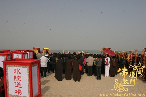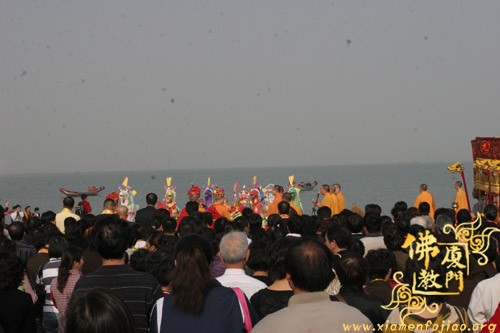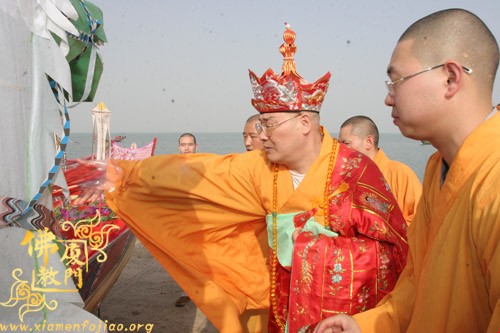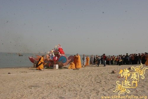 送圣巡游队伍提炉、持幡、口称佛号,铜锣开道从内坛至大坛,巡虎溪岩寺一周。在厦门观音山海边临时安置的供桌摆放贡品,在供桌的前面是一尊纸糊的镇坛大将军,镇坛大将军的手中持着“慈航普渡”和“镇守坛前”的幡旗。镇坛大将军的后面是一艘纸糊的西方大船,在大众诵经、持诵大悲神咒声中,将二十四席牌一一放到西方大船里,由圣辉大和尚执火点燃西方法船。共同祈愿世界和平,国泰民安;现在者身心康泰,故去者得生极乐。最后,圣辉大和尚祝愿大家身体健康,平安幸福,阖家欢乐,和谐进步。