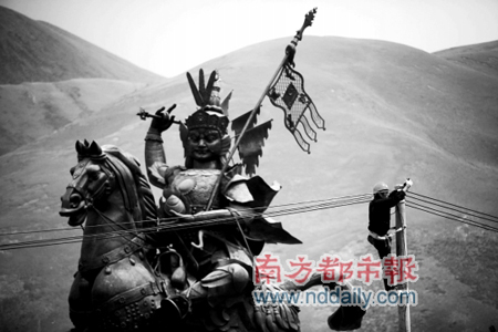 矗立着格萨尔王铜像的格萨尔王广场上,电力部门工作人员正在抢修线路。