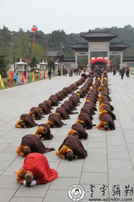 随后,全山僧众在怡藏法师的引领下由大山门外三步一拜向露天弥勒大佛浩荡前行,将功德回向:世界和平、灾难不起,国家兴盛、百姓安和,并将象征 “家庭”、“事业”、“财运”、“学业”、“健康”的五色卡上填上心中的祈愿放于龙华广场中心设置的巨型布袋——乾坤袋中,这象征着大众向大慈弥勒菩萨种下善缘,许下对未来生活的美好愿望。