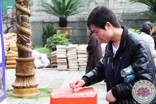 在工作人员布置募捐展台之时,就有东林寺僧众及大量信众、游客来到东林慈善功德会赈灾募捐展台前了解灾区情况,当从工作人员口中得知灾区死亡人数已经超过1400人的时候,很多信众流下了慈悲的泪水并奉献了他们对灾区人民的一份爱心。在活动期间很多家长带领自己的孩子为灾区人民奉献自己的一份心意,希望在为灾区人民奉献爱心的同时也能够教育自己的子女爱国、爱人,成为一个具有善心、能为善行的人。一位拄着拐杖的老人在女儿的搀扶下看完我们的展板介绍后,将自己囊中所有的财物全部投入捐款箱中,工作人员还未来得及鞠躬致谢,老人便转身在女儿的搀扶下离开了。