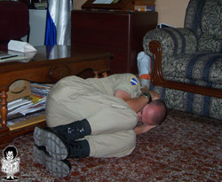 Trujillo消防部门的救援总负责人是Trujillo大学教授。他陪伴我同行,他说:“我叫Roberto Rosales,我是Trujillo的首席救援者。我11岁时,我被陷在一幢倒塌的建筑物里。就是发生在1972年的那场地震中,当时有7万人死亡。我利用我哥哥摩托车旁的‘救命三角’保住了生命。我的朋友们,躲在床下,桌子下的人都死了,我可以称作是‘生命三角’活生生的例子,而我那些朋友是“蹲下和掩护”的例子。”