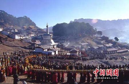 今年正月,郎木寺举行晒佛节。(来源:中国新闻网)