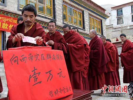 2010年4月2日,藏传佛教最大寺院哲蚌寺僧人等2日下午在该寺排长队,为中国西南旱灾地区捐款献爱心。该寺僧人表示,佛教以慈悲为怀,济世度人是其本职,西南旱灾地区同胞有难,伸手相援理所应当,不在乎钱多与少,是他们一片心意。