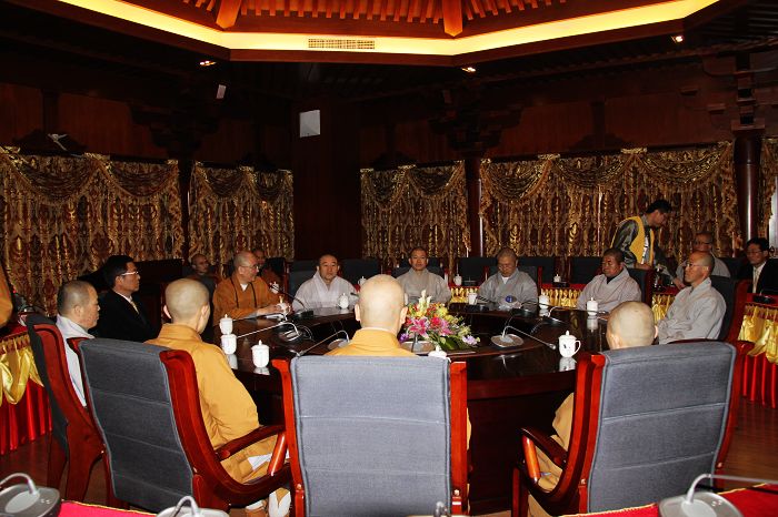 十一点,学诚法师在明心阁与韩国佛教天台宗参访团举行座谈。韩国一行代表主要有韩国佛教天台宗总务院长朱正山长老,天台宗教育部部长、天台茶文化研究会会长金世运,还有天台宗一些寺院的住持等一行16人。