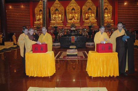 在庄严肃穆的气氛中,“为玉树地震灾区祈福募捐法会”开始举行。明海大和尚带领全寺僧众和居士一起为灾区众生祈福,祈愿灾区人民尽早渡过难关、重建家园;祈愿祖国国泰民安,风调雨顺。法会结束后,柏林禅寺四众弟子纷纷献出爱心,为灾区的受灾民众捐款。