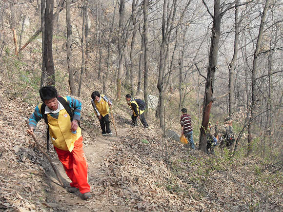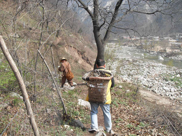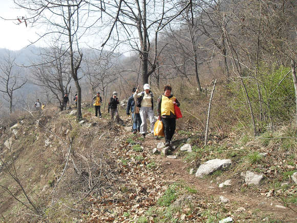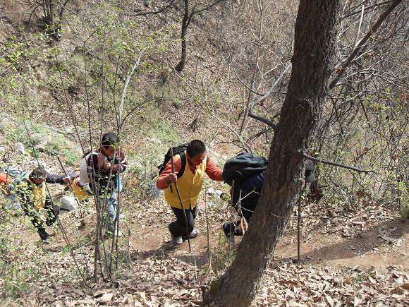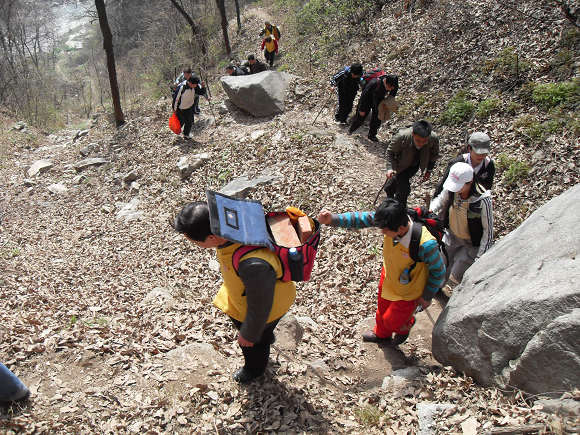 第一段的路途比较平坦,带队师兄就让这位女组长带领体力较弱的师兄负责第一段的任务。据师父说,第二、第三段的路最难走,于是体力最好的师兄被安排在中间,因西观音寺位于山谷中,爬到山顶后,要再下个坡才能到,第四段的路程是负重时下坡,于是较年轻又少有登山经验的师兄就被安排在了最后一段。
