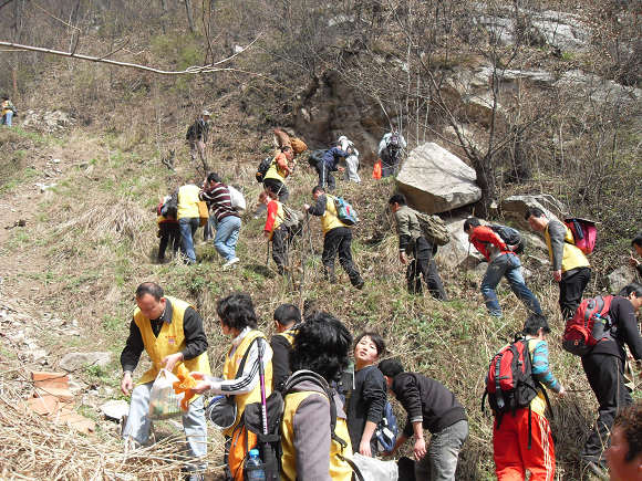 带队师兄与师商议将三十余人分为四组,计划以接力的形式,将山麓下的砖块运至西观音寺。分组前先要选出四位组长,没想到的是,第一个应征的竟然是位年近五十的女师兄,好个巾帼不让须眉啊!大家一看,热情更加高涨起来。今天发心来背砖的女师兄近半数,如此的男女比例,如此的超重负荷,对于这些常年在办公室工作从未从事过体力劳动的人们来说,着实让人捏了把汗。