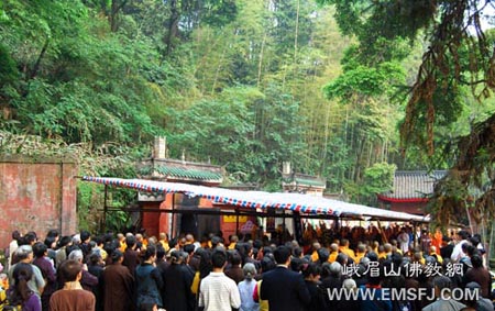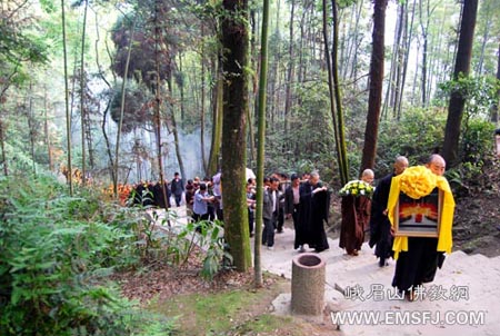 当天早上6时,峨眉山佛教协会在峨眉山报国寺通永长老的灵堂前举行了庄重的法会,7时许,通永长老的法体在众多僧尼、居士的护佑下从报国寺起程前往距报国寺约2公里的萝峰庵。