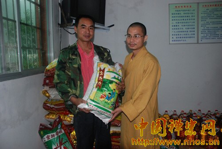 近日,中国南方暴雨使广东韶关、清远、惠州、广州等7市38县(市、区)305个乡(镇)不同程度的遭受洪涝灾害,韶关市南华禅寺方丈传正法师及两序大众得知曲江区樟市镇芦溪瑶族村560多位瑶族同胞生活受困的消息后,由南华禅寺悟佛法师代表南华禅寺僧众冒雨将一车粮油押送到芦溪村。