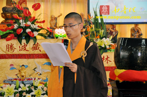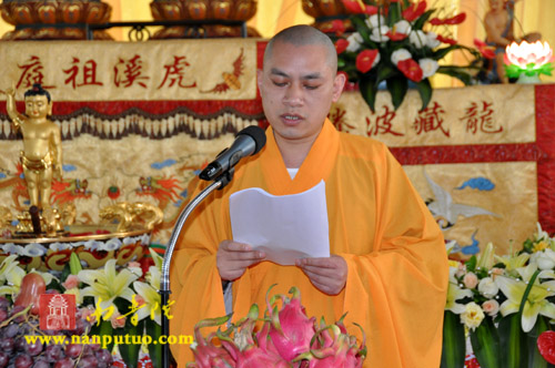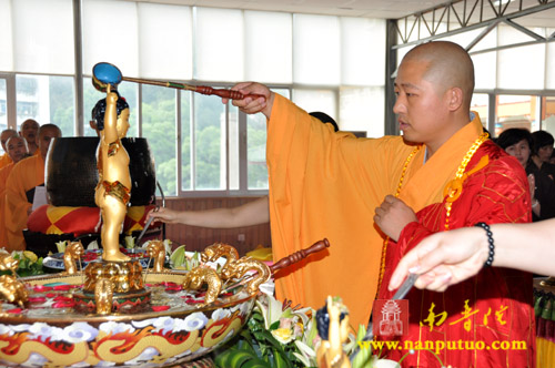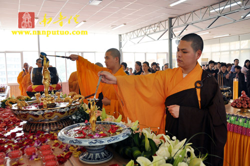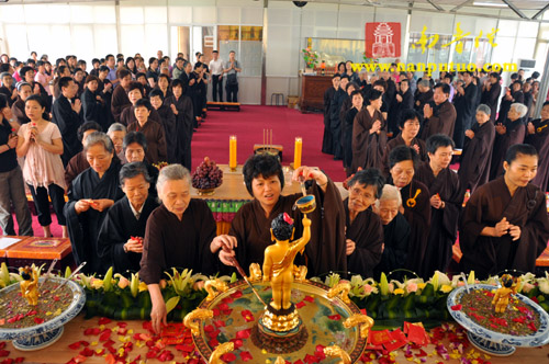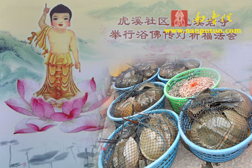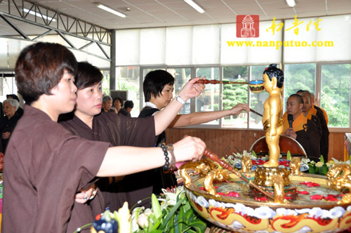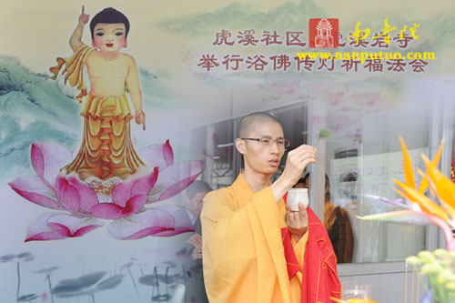 上午8时30分,浴佛法会正式开始,虎溪岩寺监院净心法师将太子像恭奉于香水盆中。在连绵不断的佛号声中,大众依次上前以净水灌沐佛身,通过浴佛,涤除人们心中的烦恼、尘垢,以得身心清净、永离杂染。随后,举行放生仪式,祈望水族类等逢此佛诞日,得脱苦轮,往生净土。
