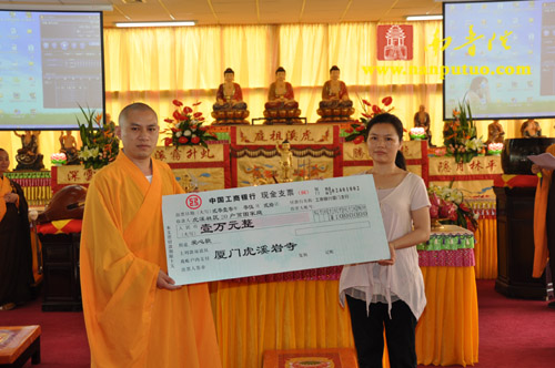 2010年5月20日,适逢浴佛节前夕,厦门虎溪岩寺举行隆重的浴佛、传灯祈福法会。在法会开始前,首先举行了爱心捐赠仪式,虎溪岩寺本次捐出善款一万元资助虎溪社区的20户特困家庭,为该社区的公益事业再尽一份绵薄之力。