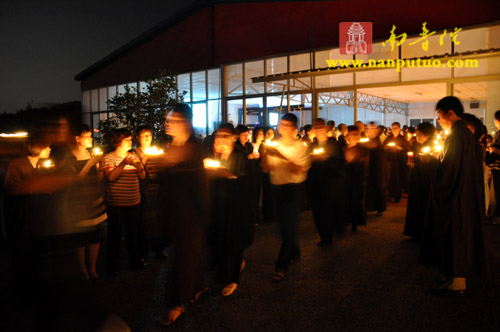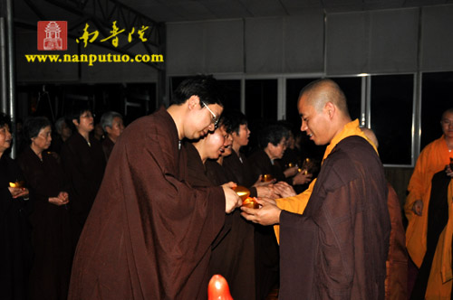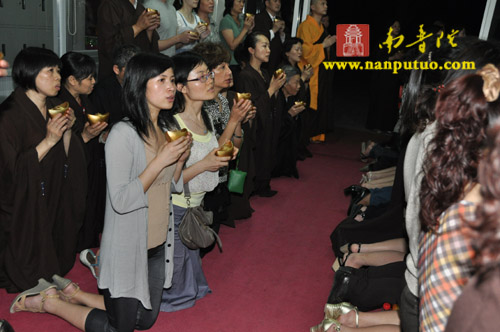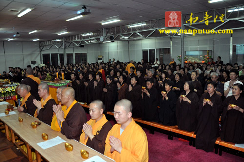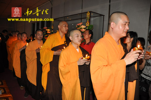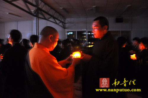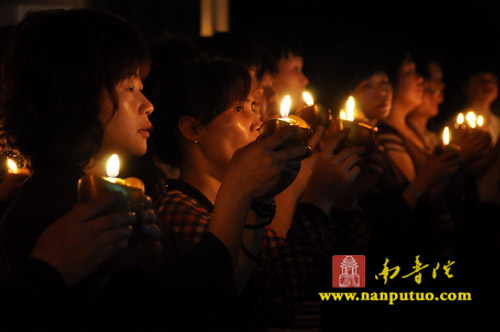 晚7时整,“传灯法会”在渺渺梵音中拉开序幕。一时,该寺大殿内钟鼓齐鸣,僧俗四众手持元宝灯恭敬合十而立,齐诵“南无本师释迦牟尼佛”,低沉浑厚的唱诵声在殿内回荡,气氛庄严肃穆。惟仰佛陀无量的智慧和光明,破除众生内心深处的无明与痴暗,燃亮人人本具的心灯一盏,愿此灯灯相传,光光互照,普世吉祥,人民安乐。