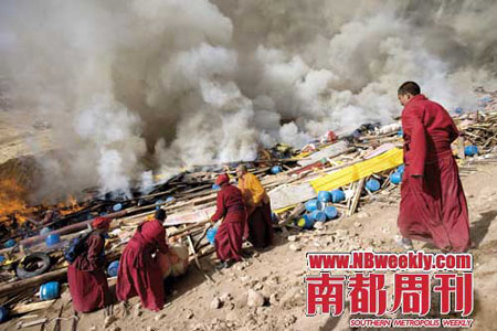 僧侣们为地震中遇难的藏民举行火葬,并诵经超度。