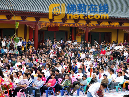 开光法会典礼结束后,来自河南嵩山少林寺武术学校的武僧为嘉宾们进行了精湛的武术表演;下午3时,上林县莲音寺住持昌杰法师、辽宁归茗寺住持通逵法师共同主法,引领信众举行了放生法会。