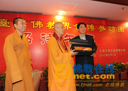 当天中午,由嘉定区佛教协会主办、留云寺承办的招待午宴在留云寺万佛堂隆重举行。在简短而隆重的欢迎仪式上,慧禅法师发表了热情洋溢的欢迎词。张敏部长代表嘉定区统战部向净良长老送上了极具嘉定地方特色的竹刻纪念品。净良长老代表参访团致答谢词。他对嘉定区佛教界的发展表示赞叹,并对嘉定区佛教界的热情接待表示感谢。他还表示,将积极推动和促进台湾和大陆佛教界之间的友好往来,互通有无,彼此共进。