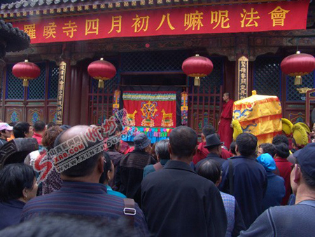 2010年5月21日(农历四月初八)下午4时,山西省五台山罗睺寺内,僧众云集,信众朝礼。来自五台山所有藏传寺庙的比丘、比丘尼以及内蒙古五当召等多处寺院的僧众集体修持,加持嘛呢甘露丸。身着各色民族服饰的人们,参加了该寺一年一度农历四月初八举办的嘛呢法会。