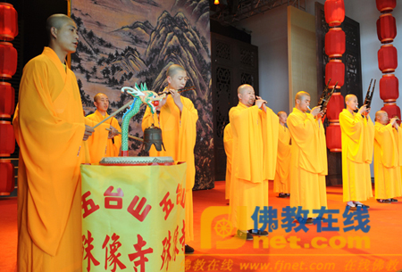 2010年5月21日,上海世博会山西活动周期间,来自五台山的僧人在世博园宝钢大舞台展演区,表演国家级非物质文化遗产五台山佛乐。