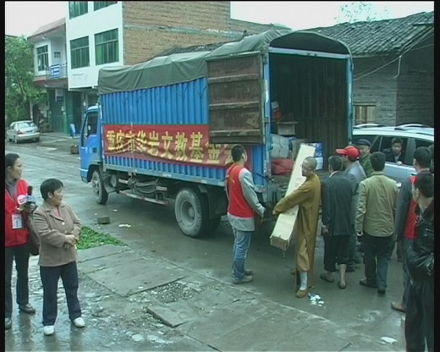 时间来到5月7日早上八点,一辆蓝色大货车在垫江沙坪镇李白村的乡村路上驰行,车身上大红的标语上赫然写着“重庆华岩文教基金会”几个大字。文教基金会救援队一行正赶往李白村村办公室。