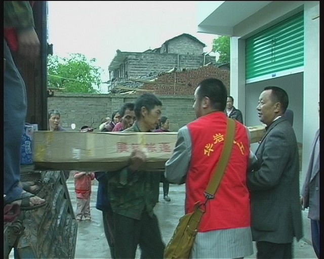 我们不忍再听惨痛的灾情与村干部们一起卸下救灾物资,一位当地企业主也加入到我们的队伍中,我们将剩下的帐篷、棉被、牛奶、饼干、八宝粥等物全部交给了村里,当他们接过最后一件救灾物资时,我们感到无比欣慰。