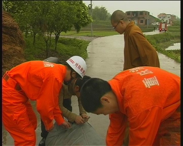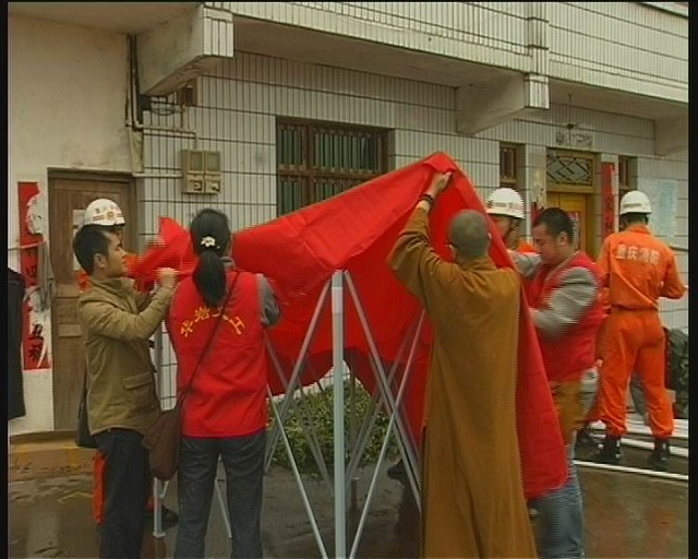 在吴书记的组织和带领下,救援队很快将紧急救援物资逐个发放到了每一位受灾的村民手中,满头白发的老人眼含热泪接过东西,不住地说:“谢谢,谢谢!”。领到了救援物资,村民们紧皱的眉头渐渐舒展,然而,损毁的房屋依旧是他们面临的极大困难。救援队又和消防官兵一起替他们搭起了帐篷,让他们在灾后的风雨中有一个暂时的栖身之所。在这一刻,黄色的僧衣、鲜红的华岩义工背心和消防官兵橙色的制服交相辉映,三种颜色汇聚成爱心的色彩。在党和政府的领导下,在救援队的帮助下,受灾的村民情绪稳定,积极展开自救,相信在不久的将来,我们一定会看到一座全新的李白村在沙坪镇拔地而起。