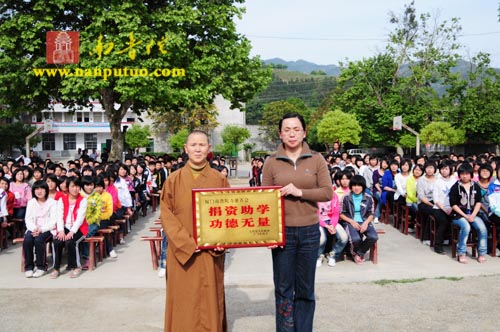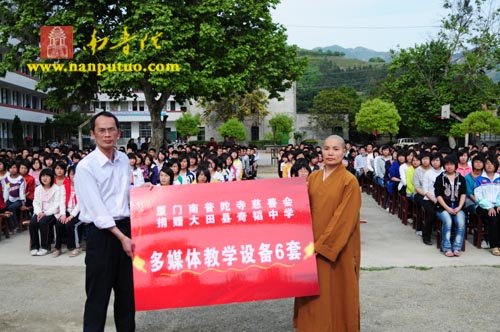 4月28日,受南普陀寺慈善会会长圣辉大和尚嘱托,德鸣法师、通灵法师、静仁法师一行驱车来到福建省大田县奇韬镇奇韬中学,参加“南普陀寺慈善会向大田县奇韬中学捐赠多媒体教学设备交接仪式。”我会向该校捐赠6套多媒体教学设备,价值16万余元。