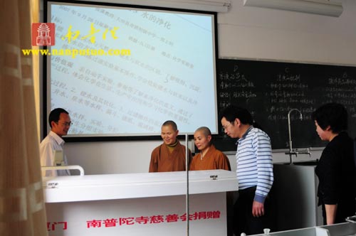 捐赠仪式上,全校师生同唱歌曲“感恩的心”,表达对我会善举的感恩之情。仪式结束后,德鸣法师一行又参观了已经安装好的6套多媒体教学设备,看到同学们用上了先进的教学设备,法师们露出了欣慰的笑容。