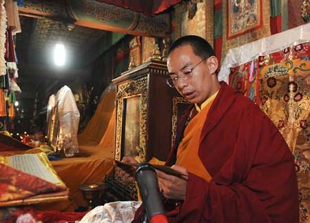 5月15日,中国佛教协会副会长第十一世班禅额尔德尼·确吉杰布刚刚结束在玉树地震灾区的行程后,于5月15日专程到青海塔尔寺举行法会。