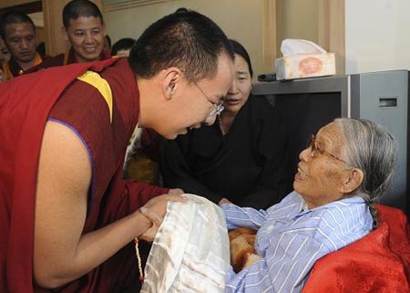 5月15日,中国佛教协会副会长第十一世班禅额尔德尼·确吉杰布前往青海省人民医院探望十世班禅大师的母亲尧西·索朗卓玛,祝愿圣母健康长寿。(图片来源:新华社记者 李学仁 摄)