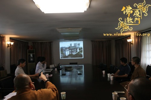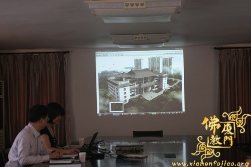 五洲工程设计研究院厦门分院院长黄乐涛、建筑师乐艺就妙释寺用地现状、效果图、平面图等作了详细讲解。并听取了与会法师提出的关于按照消防要求设计、扩大会议室等的修改意见。进一步推动妙释寺重建工作。