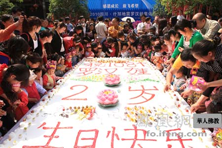 华人佛教什邡讯 2010年5月10日上午,2010四川什邡地震罗汉娃集体生日会在罗汉寺举行。四川省宗教局局长王增健、德阳市宗教局局长刘兄英、什邡市宗教局局长游勇、成都大慈寺方丈大恩法师、新都宝光寺方丈意寂法师、龙泉石经寺方丈素慧法师、四川尼众佛学院院长如意法师、彭州三昧禅林广诚法师、深圳市政府抗震救灾先遣队队员何文、台湾慈济功德会代表、台湾法鼓山代表、108个在5·12地震中出生在什邡罗汉寺的宝宝及家长、社会各界爱心人士共计400余人参加了活动。罗汉寺方丈素全法师和四川电视台节目主持人叮当共同主持了此次生日会。