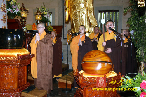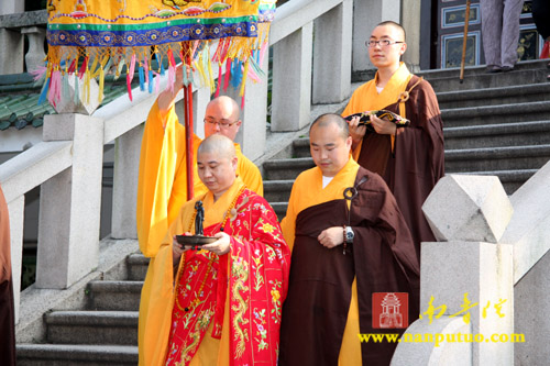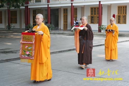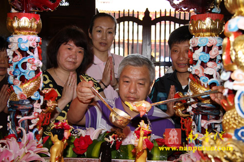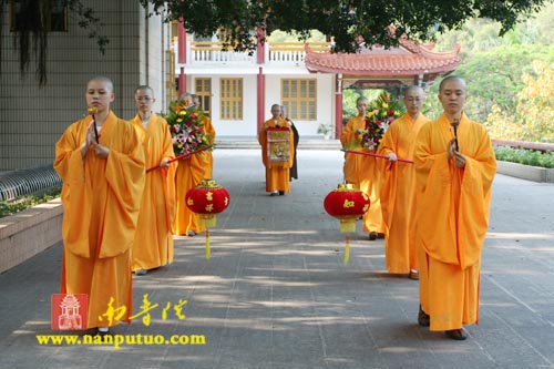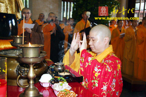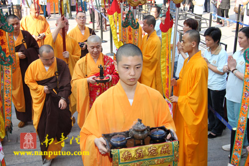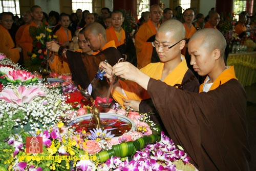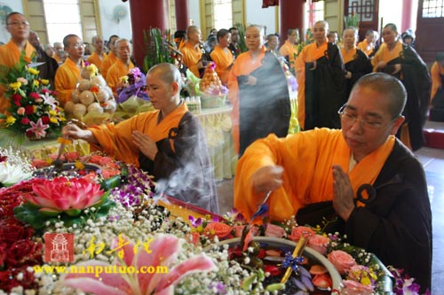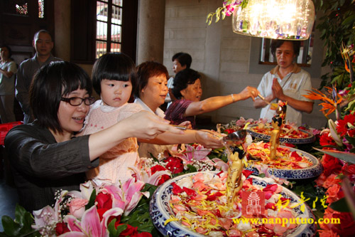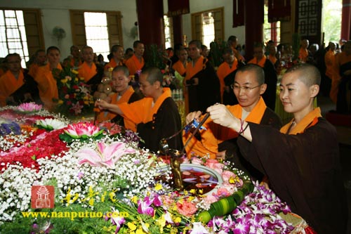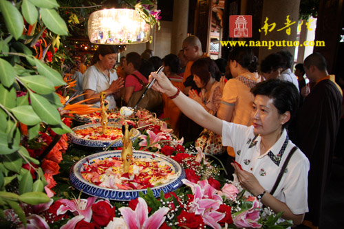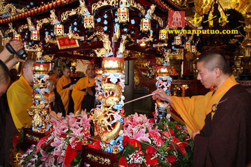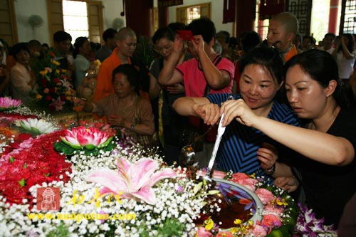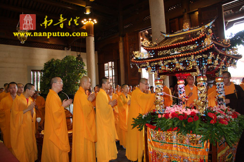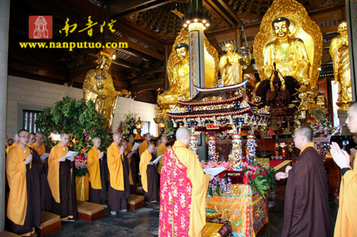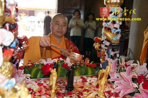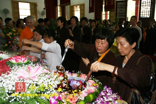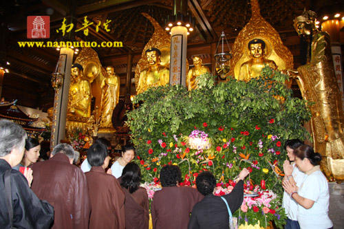 上午7时30分,南普陀寺两序仪仗队幢幡高树,法器声声悦耳,方丈则悟大和尚手托太子金像走进大雄宝殿,僧众庄严肃立,恭迎圣驾。唱诵过后,大和尚领众浴佛,僧俗大众依次在蓝毗尼园浴佛亭前跪拜问讯,手执金匙于香汤盆内盛水浴佛,口诵“我今灌沐诸如来,净智功德庄严聚,五浊众生令离垢,愿证如来净法身”的偈颂。法会一直持续到中午,信众游客蒙受法益,同享法喜。