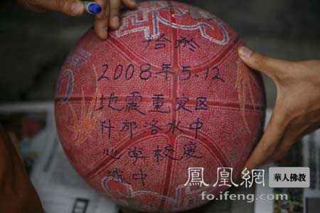 5•12地震发生后,位于震区的什邡罗汉寺素全法师,第一时间赶赴现场展开救援工作。在蓥华镇,他看到一位失去孩子的父亲把一个崭新的篮球葬在孩子身边,这是孩子用押岁钱买的,还没有来得及使用,这一幕让素全法师十分感触。2008年5月23号下午,四川省宗教局王局长、上海龙华寺方丈照诚法师、什邡罗汉寺住持素全法师、凤凰网华人佛教外采团队一行数人来到什邡市洛水镇洛水中学和洛城中心小学,面对这些悲苦的废墟,法师们照例要念一卷超度的经,超度毕,照诚法师和素全法师开始在废墟中寻找那些孩子的踪迹,课本、作业本、文具盒……这悲惨的一幕幕触动着法师的心,他们久久矗立在那片废墟上,久久凝视着这些曾经充满欢歌笑语的空间,不经意间,他们发现在废墟的瓦砾旁孩子们不曾带去天国的两个篮球,似乎在诉说着以往鲜活的生命,照诚法师拾起这两个篮球……,久久地抚摸着两个篮球……。照诚法师把这两个篮球带回了罗汉寺,法师本打算把球带回上海龙华古寺,作为此次来到灾区的一个纪念,或者带回上海以后把这个特殊的篮球拍卖掉,可以筹集到一笔善款用于重建洛城小学,这也是一件非常有意义的事情……经与素全法师商量,还是决定将球的保管权通过适当的形式义卖,将义卖的经费用于购置体育器材送给孩子们。2008年是奥运年,法师们很想用奥运精神激励幸存的孩子,不屈不挠,传承希望,这就是义卖的信念和动力。