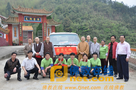 2010年4月29日(农历三月十六日),广东省梅州市千佛塔慈济会执行会长、千佛塔寺当家师耀航法师,肩负着会长明慧法师的嘱托,带领“慈悲之旅”一行12人,分乘两辆贴着“千佛塔慈济会扶贫专车”标识的面包车,满载百包大米和油,顺着弯弯的山道,疾驰两个多小时,到梅州市最偏远的丰顺县八乡山,派送粮油给山寨的贫困户。丰顺镇党委纪委许妙言书记和民政办许发祥主任热情接待。