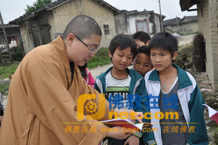 据了解,这次派送的粮油是十方善信们供养千佛塔寺法师的,法师们一日只吃两顿,省下来扶助偏远贫困山区的贫苦大众,意义不比寻常!对一些因身体残疾等种种原因不能到现场领取的,“慈悲之旅”不辞劳苦深入村寨,派送到户。当“慈悲之旅”到贵人村74岁廖天华家,他兴奋地连声说“谢谢”!并随“慈悲之旅”一同唱颂“阿弥陀佛”圣号,法师们耐心地向他们讲述因果的道理,希望他们从心里向善,改变贫穷命运。山寨的孩子见有稀客来,都相邀簇拥着争要善书——《弟子规》,琅琅的读书声响彻村寨,法师们教孩子们好好读诵中华民族优秀文化,懂得做人的道理,长大做一个觉悟人生的人。看到孩子们一双双渴望的眼神,“慈悲之旅”成员心里边酸酸的,直感到孩子们多么需要以孝道为根本的古德文化滋润!