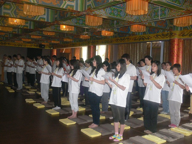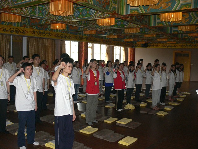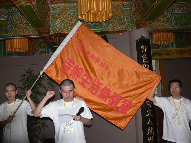 2010年05月01日 重庆市华岩寺为期三天的第九届丛林生活体验营正式开营。上午,来自四面八方的营员们陆续前来报到,接待、发放营服,安排住宿,华岩义工们忙碌着。下午两点整,重庆华岩寺方丈道坚法师、重庆华岩文教基金会秘书长心河法师、重庆佛学院训导主任证性法师、义悲法师、西相法师等在华岩寺禅修中心与营员们举行见面会与授旗仪式。见面会上道坚法师要求大家在这三天时间里抛开世俗的烦琐之事,一心体验中国传统的礼仪与严格的僧团生活,通过实修,了证真理。在授旗仪式上,道坚法师将重庆华岩寺第九届丛林体验营营旗庄重地递到旗手手上,全体营员在营旗下庄严的宣誓声响彻了禅堂。参加见面会的法师在会上并分别致辞,鼓励营员们互相关心,实实在在体验,真真正正修行。