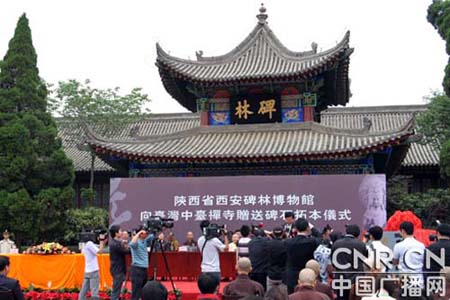 2010年5月5日上午,陕西省西安碑林博物馆举行向台湾中台禅寺赠送碑石拓本仪式,共赠送西安碑林藏石拓本528种、墓志拓本745种,共计1273种,囊括了历代著名碑刻。所赠送的拓本数量之大、品类之全,在该馆历史上尚属首次。