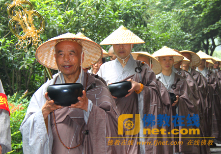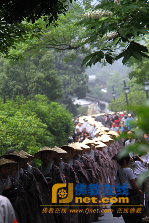 翠微苍茫的山路,竹黄斗笠、青灰衣衫,虽然艳阳高照,汗水浸湿衣衫,额头上滑落的水珠模糊了视线,僧人们却毫不挂碍,形神安闲如山边流云,双手稳稳地托起钵盂,芒鞋稳健地踏在布满苍苔的石路上,而早已恭候多时的人群在道路两旁排起了长长的队伍,争相将备好的供养物投入法师钵中。这里有杭城寺院的居士,有闻讯特地赶来的信众,有附近店铺的商人,有因缘至此的香游客,有偶然经过的路人,不同的年龄,不同的身份,不同的因缘,却都有着一颗相同的求上、求善、求圆满之心。一群白发苍苍的老人双手在胸前合十齐声唱着南无本师释迦牟尼佛,一位稚气未脱的小女孩挤在人群中将零钱放入钵中,一位身穿海青的中年妇女跪在路边深深地将头伏下,一位年轻男子双手捧着善款高举过头顶,虔诚顶礼……长长的队伍中,欢喜、泪光、感恩、欣喜……交织成了一曲动人心弦的乐章。