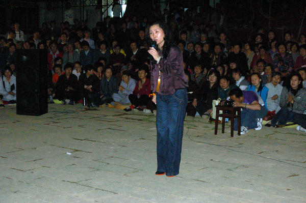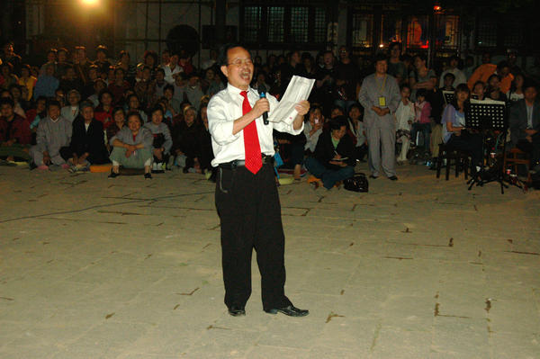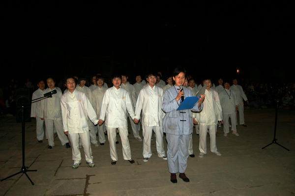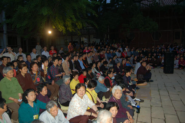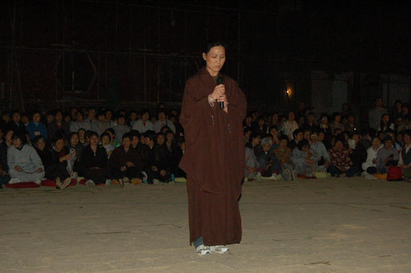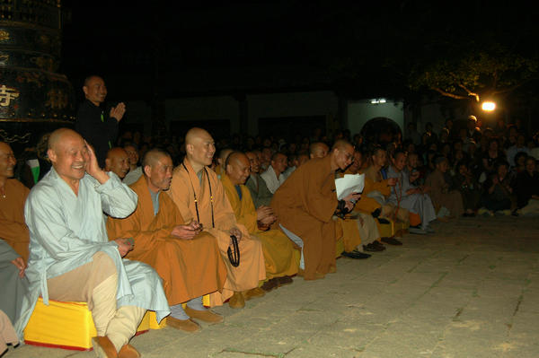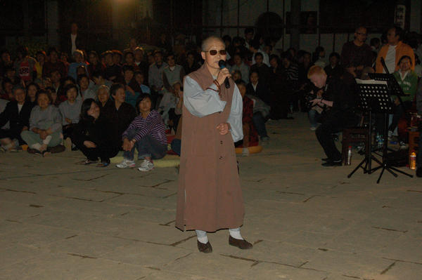 2010年5月7日晚,参加东林寺五一精进佛七的四众弟子,带着经行念佛后的法喜,在大雄宝殿广场围成口字型就坐,举行了别开生面的“佛七夜话”,一边表演自创的文艺节目,一边畅谈参加佛七的心得体会,度过了一个欢乐祥和的夜晚。