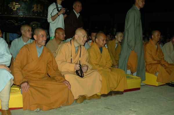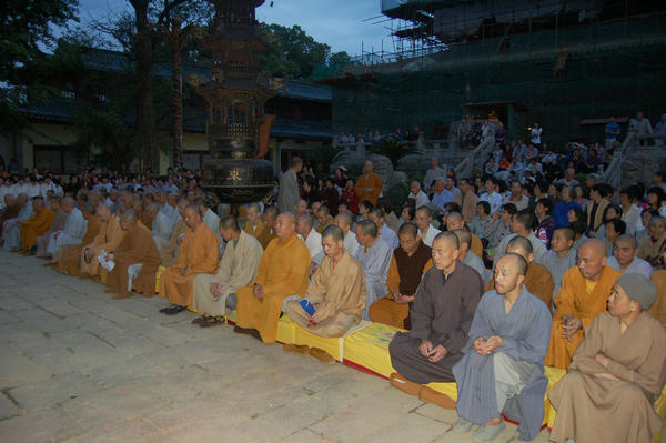 晚6点半左右,在热烈的掌声中,主七和尚大安法师在首座和尚本通法师等陪同下,来到会场面南跏趺而坐,与大家同享佛七经行念佛的法乐。