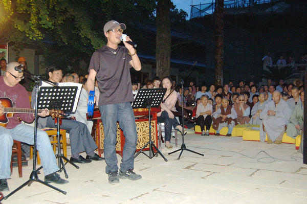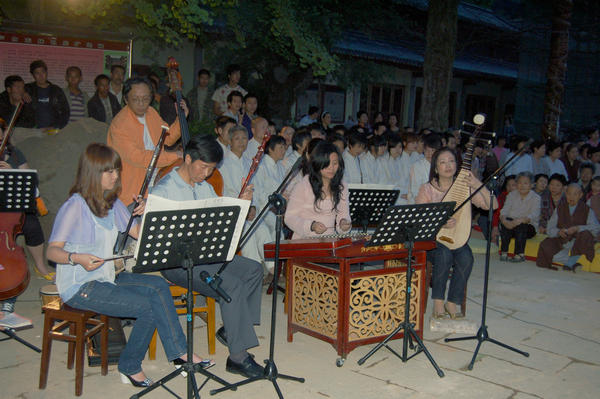 今年三月份在大安法师座下皈依佛教的省歌舞剧院民乐队的十几位乐手和歌手,携带各类乐器,专程从南昌赶来东林寺为晚会助兴。